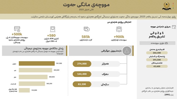 تیمی پرۆژەی هەژماری من ڕایگەیاند: سبەی چوارشەممە 1ـی تشرینی یەکەمی 2025، مووچەی مانگی حەوت (تەممووز)ـی مووچەخۆرانی هەرێم، لە ڕێگەی پرۆژەی هەژماری منەوە دابەش دەکرێت.