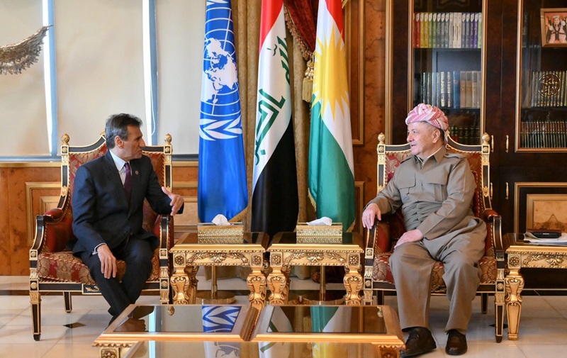 Hewlêr-KDP.info: Roja Duşemê, 10ê Mijdara 2025an, li Pîrmamê, Serok Mesûd Barzanî pêşwaziya birêz Mihemed El-Hessan, Nûnerê Taybetî yê Sekreterê Giştî yê Neteweyên Yekbûyî li Iraqê û Serokê Nûneratiya UNAMI kir.